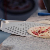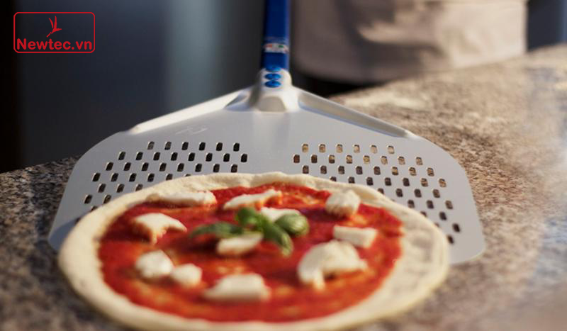 Phần mặt xẻng nhẹ và linh hoạt giúp luồn dưới đế bánh dễ hơn, trong khi các lỗ đục giúp giảm ma sát và giải phóng bột thừa, hạn chế bột bám dưới đáy pizza rồi bị cháy trong lò. Bề mặt anodized cũng giúp xẻng đều hơn và tăng khả năng chống oxy hóa.